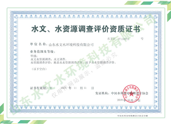 公司擁有水利工程設(shè)計(jì)、水土保持、水文水資源調(diào)查評價、水資源論證、建設(shè)項(xiàng)目環(huán)境影響評價、市政公用工程施工總承包、水利水電工程施工總承包、電子與智能化工程專業(yè)承包等資質(zhì),2017年通過質(zhì)量管理體系、環(huán)境管理體系、職業(yè)健康安全管理體系認(rèn)證;2020年被評為國家級高新技術(shù)企業(yè),同年被中國水利企業(yè)協(xié)會推薦為第一批“合同節(jié)水服務(wù)企業(yè)”;2021年被山東省、濟(jì)南市評為 “專精特新”中小企業(yè)。業(yè)務(wù)范圍涉及水利工程設(shè)計(jì);節(jié)水設(shè)計(jì)、改造、水平衡測試;山洪災(zāi)害調(diào)查;城市水資源調(diào)查評價;建設(shè)項(xiàng)目水土保持方案編制、監(jiān)測、驗(yàn)收、水土保持規(guī)劃;水安全保障規(guī)劃、建設(shè)項(xiàng)目水資源論證、規(guī)劃水資源論證;建設(shè)項(xiàng)目環(huán)境影響評價;入河排污口論證;防洪影響評價;市政公用工程施工、水利水電工程施工、電子與智能化工程施工等。